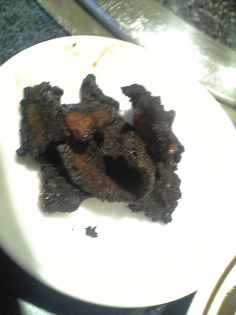 途中、ひっくり返し忘れた肉(たぶん牛)が焦げてましてね、真っ黒くろ。